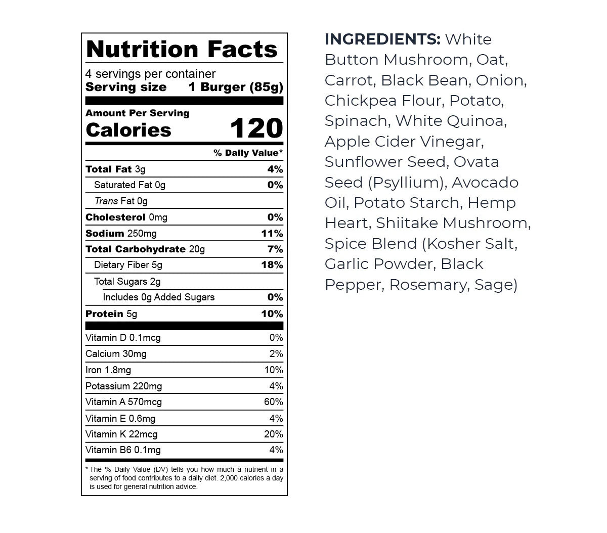 White Button Mushroom, Oat, Carrot, Black Bean, Onion, Chickpea Flour, Potato, Spinach, White Quinoa, Apple Cider Vinegar, Sunflower Seed, Ovata Seed (Psyllium), Avocado Oil, Potato Starch, Hemp Heart, Shiitake Mushroom, Spice Blend (Kosher Salt, Garlic Powder, Black Pepper, Rosemary, Sage)