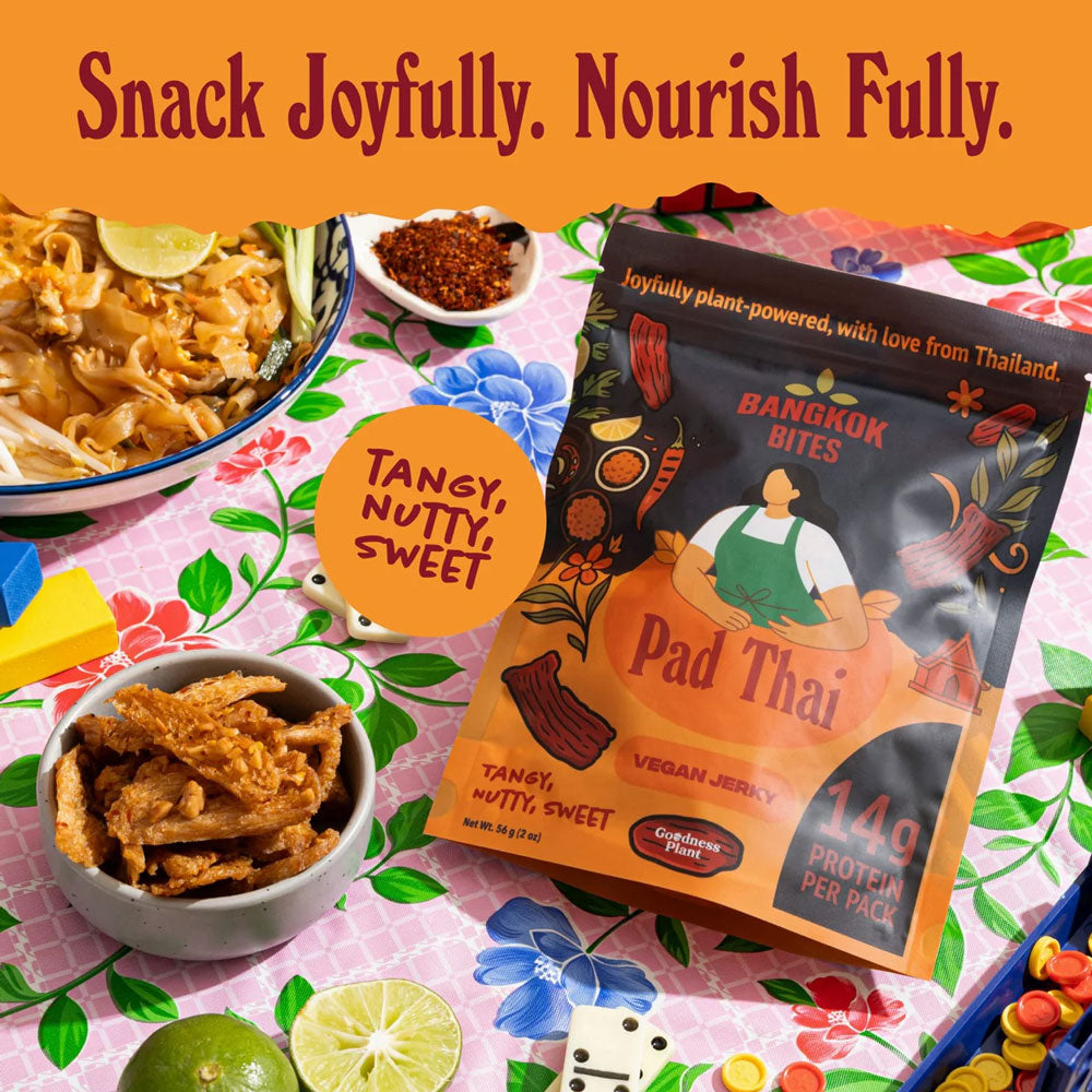 Take your taste buds on a trip to Thailand! Bangkok Bites Vegan Jerky captures the vibrant flavors of Thailand’s iconic hot and sour soup in a chewy, protein-packed snack. Zesty lemongrass, tangy kaffir lime, and a touch of chili heat come together for a mouthwatering balance of spice and citrus.