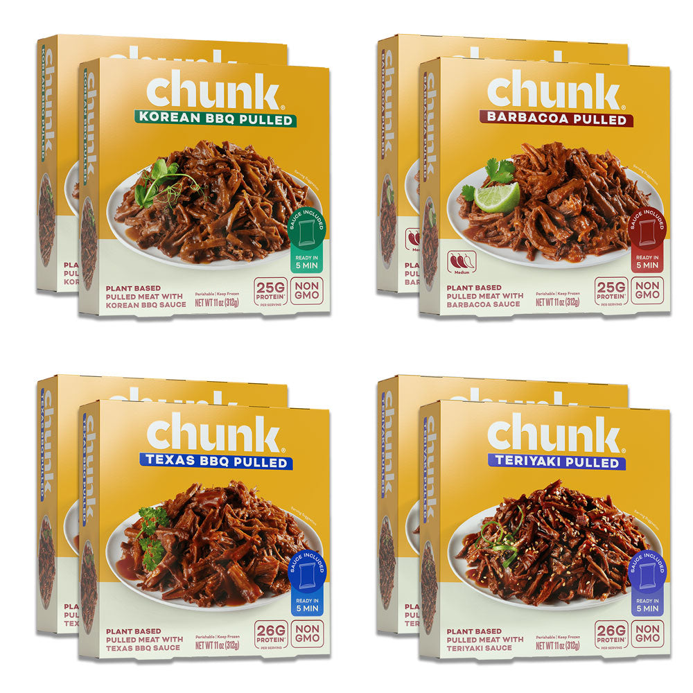 Try all of the Chunk Plant-Based Pulled, Flavored Meats! This revolutionary protein brings the pulled meat experience to your plant-based meal.