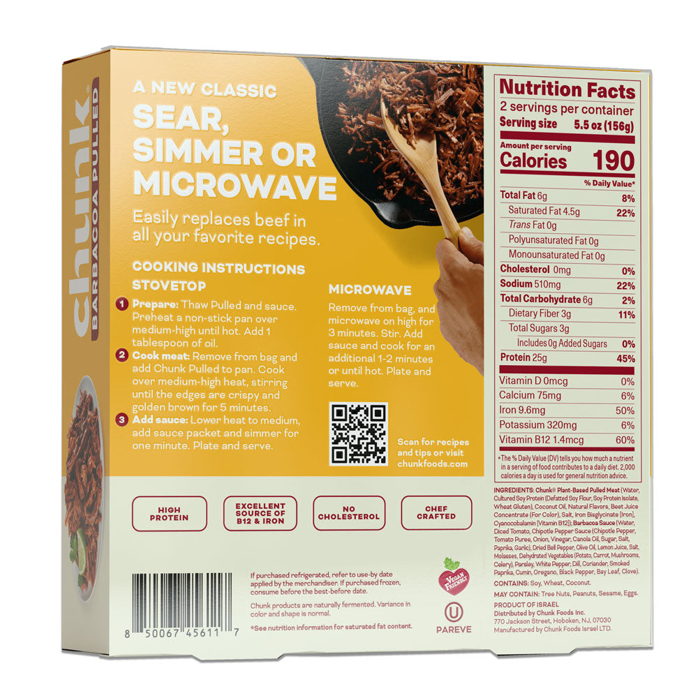 Chunk’s Plant-Based Pulled Barbacoa is crafted to replicate the tender, juicy texture of slow-cooked, juicy pulled beef or pork, with a subtle smokiness and savory richness that makes it a perfect addition to any dish. The pulled meat shreds effortlessly, making it a great fit for all your favorite dishes. Whether you're throwing together a quick weeknight dinner or hosting a backyard barbecue, this plant-based meat will impress both plant-based eaters and meat enthusiasts alike.