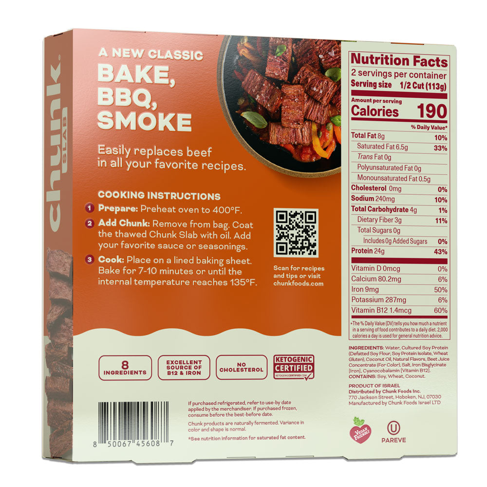 The Plant-Based Slab by Chunk boasts a savory, umami-packed flavor profile that works well in a variety of dishes. Its firm yet tender texture mimics that of a traditional slab of meat, making it ideal for a range of preparations—from grilling and broiling to marinating and slow-cooking. Whether you're preparing it as a centerpiece for a hearty meal or slicing it into strips for salads, sandwiches, or wraps, this plant-based slab will elevate your dish with its meaty taste and satisfying bite.