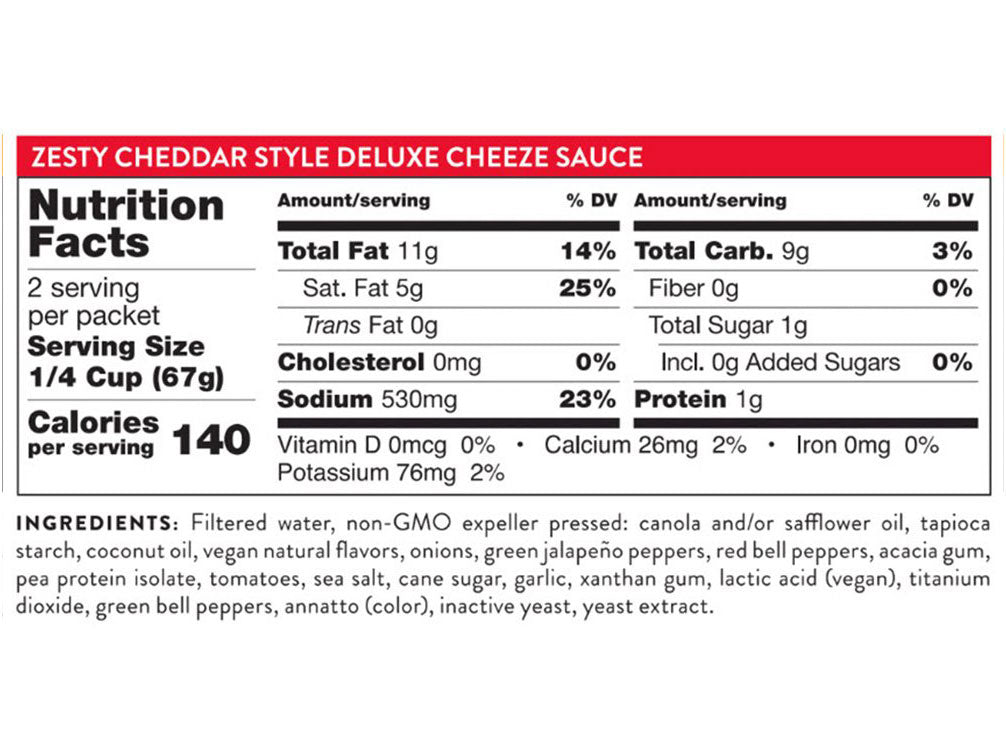 Ingredients: Filtered water, expeller pressed safflower oil, tapioca flour, coconut oil, natural flavors, onions, green jalapeño peppers, red bell peppers, acacia gum, pea protein, tomatoes, salt, cane sugar, garlic, lactic acid, xanthan gum, green bell peppers, annatto color