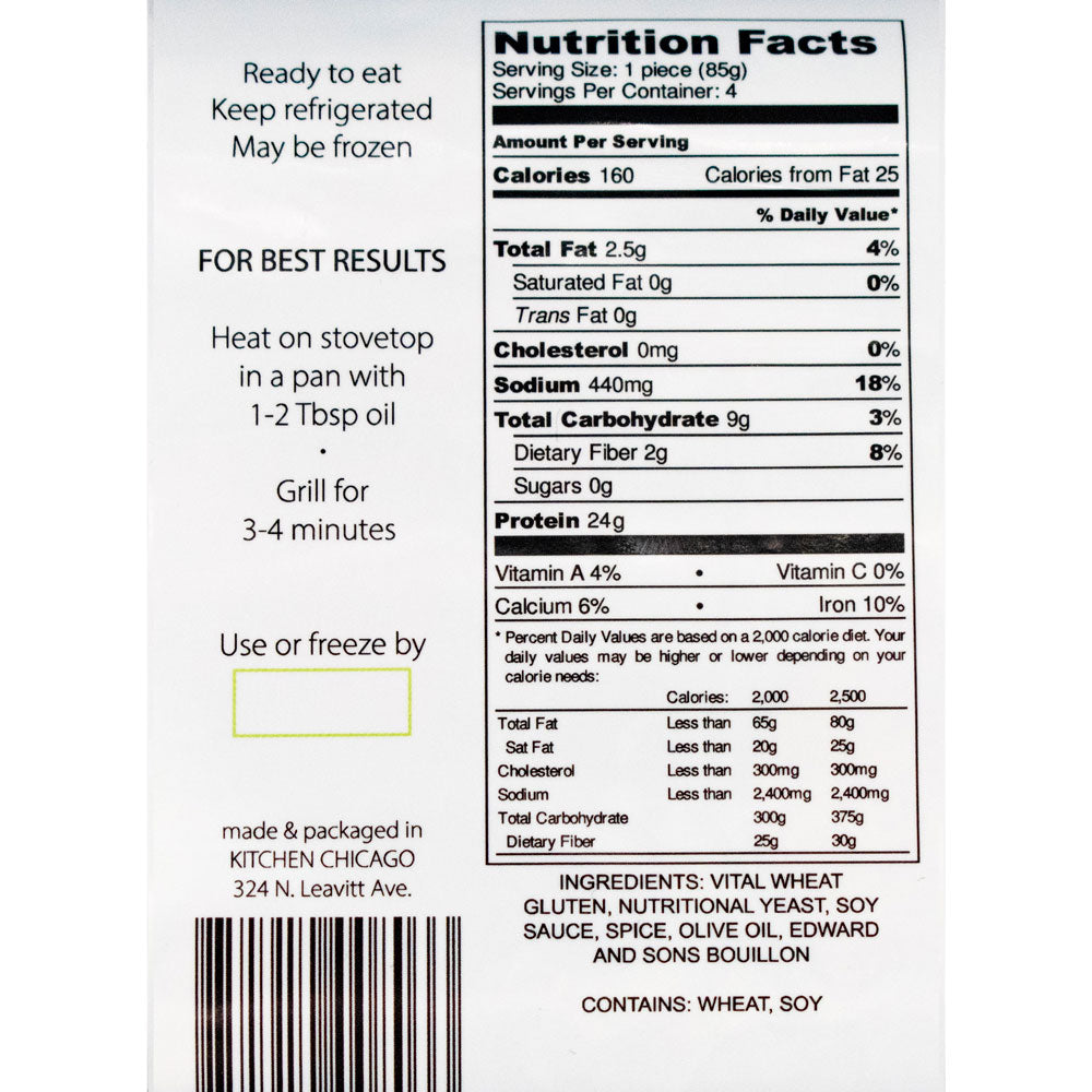 Vital Wheat Gluten, Nutritional Yeast, Vegetable Broth, Extra Virgin Olive Oil, Soy Sauce, and a blend of spices provide a flavorful, protein-rich base for these vegan sausages.