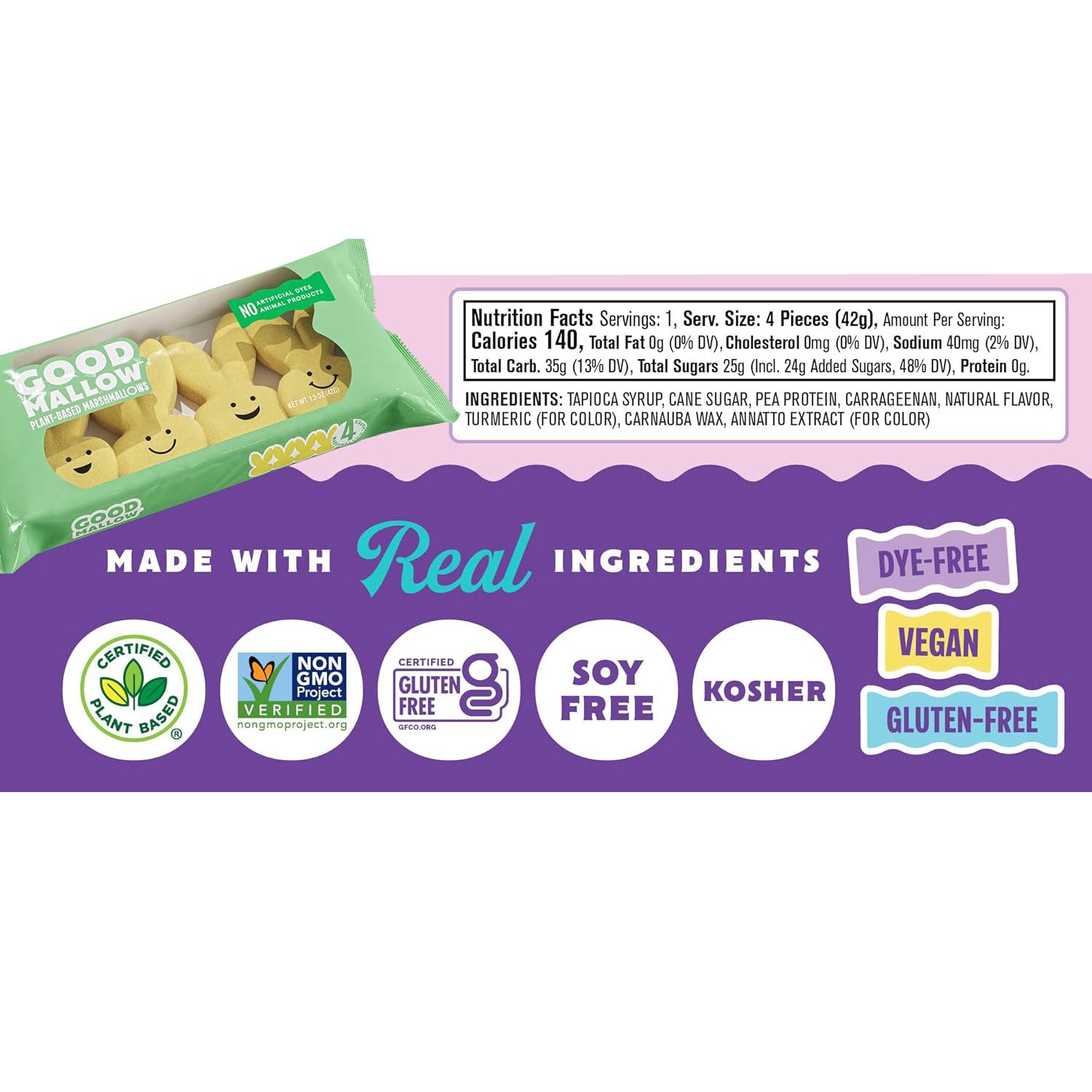 Each 1.5oz package contains 4 plant-based, yellow marshmallow bunnies.