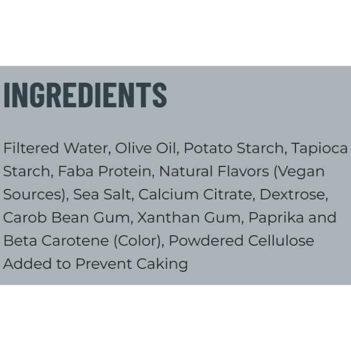 Filtered Water, Olive Oil, Potato Starch, Tapioca Starch, Faba Protein, Natural Flavors (Vegan Sources), Sea Salt, Calcium Citrate, Dextrose, Carob Bean Gum, Xanthan Gum, Paprika and Beta Carotene (Color), Powdered Cellulose Added to Prevent Caking