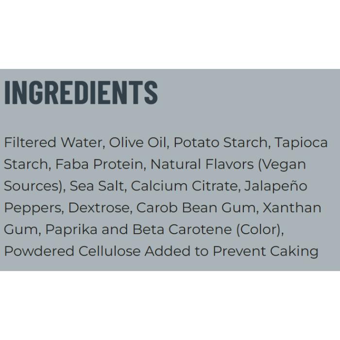 Filtered Water, Olive Oil, Potato Starch, Tapioca Starch, Faba Protein, Natural Flavors (Vegan Sources), Sea Salt, Calcium Citrate, Jalapeño Peppers, Dextrose, Carob Bean Gum, Xanthan Gum, Paprika and Beta Carotene (Color), Powdered Cellulose Added to Prevent Caking