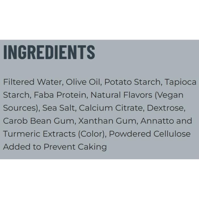 Filtered Water, Olive Oil, Potato Starch, Tapioca Starch, Faba Protein, Natural Flavors (Vegan Sources), Sea Salt, Calcium Citrate, Dextrose, Carob Bean Gum, Xanthan Gum, Annatto and Turmeric Extracts (Color), Powdered Cellulose Added to Prevent Caking