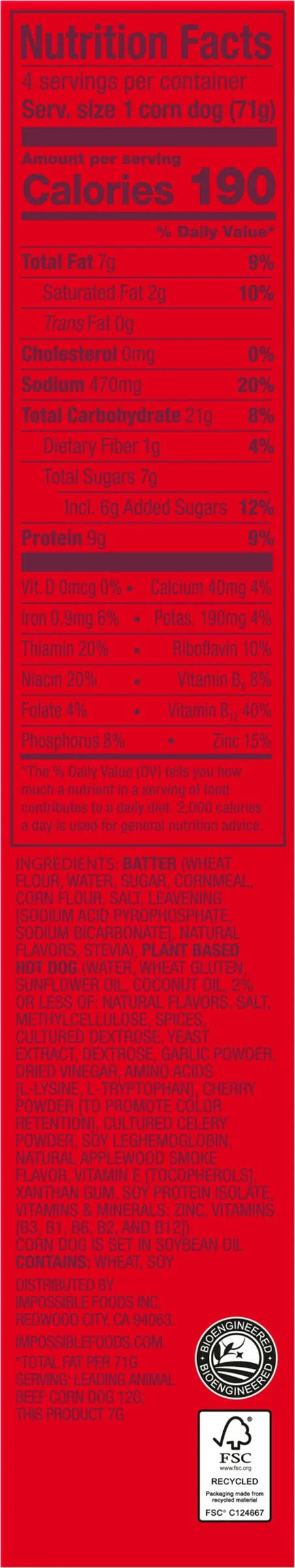 Delicious Impossible "beef" hot dogs with a delicious corn breading. 4 plant-based corn dogs per package. These corn dogs can be heated in the oven, microwave, or air-fryer. Whether you're a lifelong vegetarian, transitioning to a plant-based diet, or just looking to reduce your meat consumption, Impossible Hot Dogs provide a guilt-free, eco-friendly alternative without compromising on taste.