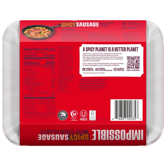 Impossible’s Spicy Sausage Links can go into wraps, pasta, and all kinds of savory dishes. Fry them or grill them, these versatile links lead to so much flavor! Best of all, they contain 30% lower total fat than regular, animal-based sausages!