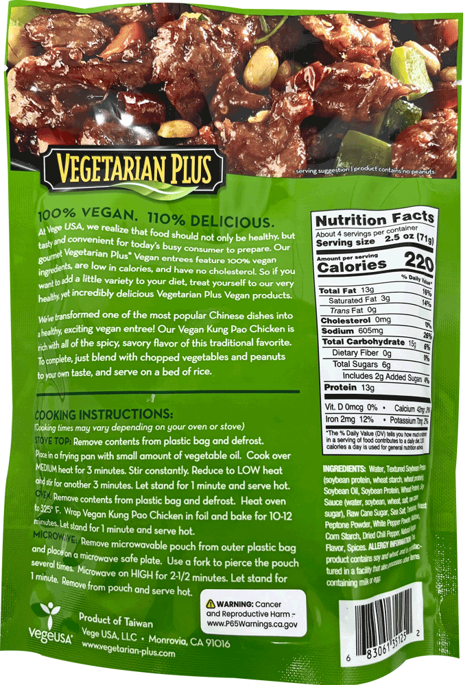 Break out your chopsticks! Vegetarian Plus has transformed one of the most popular Chinese dishes into a healthy, exciting vegan entrée. Serve over rice with chopped veggies and peanuts to make a truly authentic vegan Chinese delight, or, just eat it by itself, it’s just that good! 10.5 oz. (298g) package.