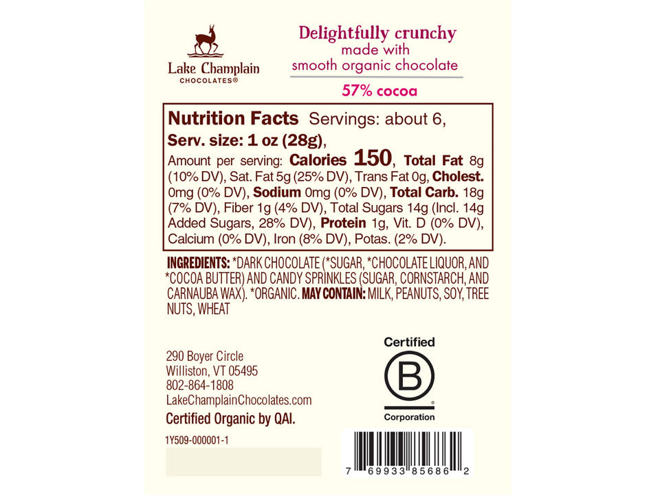 Ingredients: organic dark chocolate (sugar, chocolate liquor, and cocoa butter) and candy sprinkles (sugar, cornstarch, and carnauba wax).