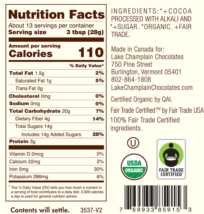 Ingredients: Cocoa processed with alkali and sugar.