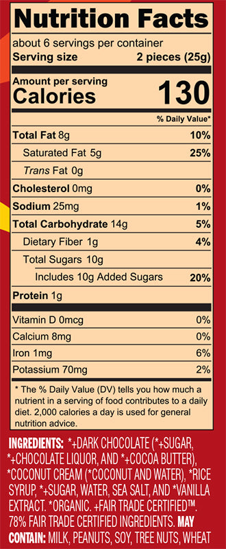 Ingredients: dark chocolate (sugar, chocolate liquor, and cocoa butter), coconut cream (coconut and water), rice syrup, sugar, water, sea salt, and vanilla extract.