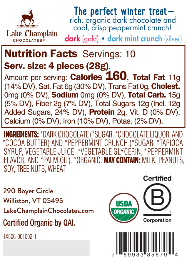 Ingredients: dark chocolate (sugar, chocolate liquor, and cocoa butter) and peppermint crunch (sugar, tapioca syrup, vegetable juice, vegetable glycerin, peppermint flavor, and palm oil).
