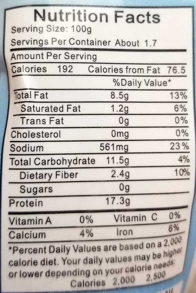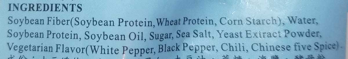 Ingredients: Soy Fiber (soybean protein, wheat protein, corn starch) Water, Soybean Protein, Soybean Oil, Sugar, Sea Salt, Yeast Extract Powder, Vegetarian Flavor (white pepper, black pepper, chili, Chinese five spice).