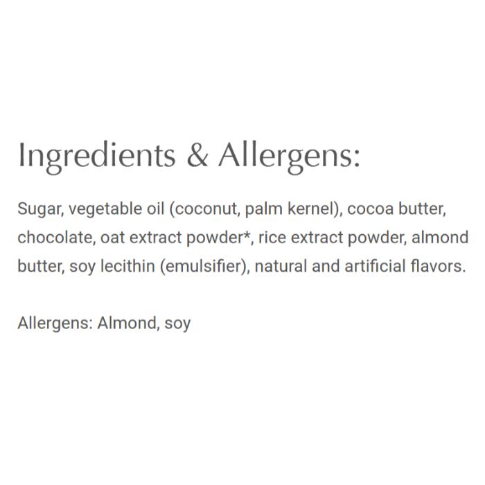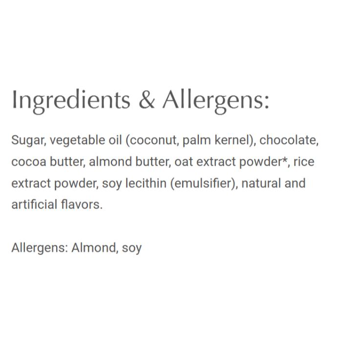 Oatmilk Dark Chocolate: Sugar, Vegetable Oil Coconut, Palm Kernel), Chocolate, Cocoa Butter, Almond Butter, Oat Extract Powder*, Rice Extract Powder, Soy Lecithin (emulsifier), Natural And Artificial Flavors