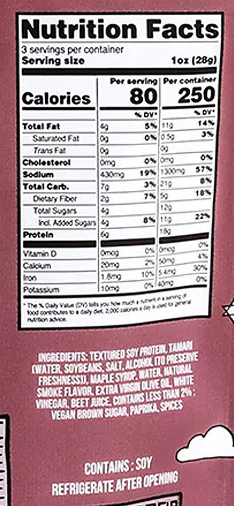 Ingredients: Textured soy protein, San-J tamari (water, soybeans, salt, alcohol), maple syrup, olive oil, vinegar, beet juice, brown sugar, contains less than 2% of: black pepper, paprika, vegan source lactic acid, natural smoke flavors