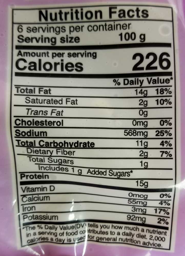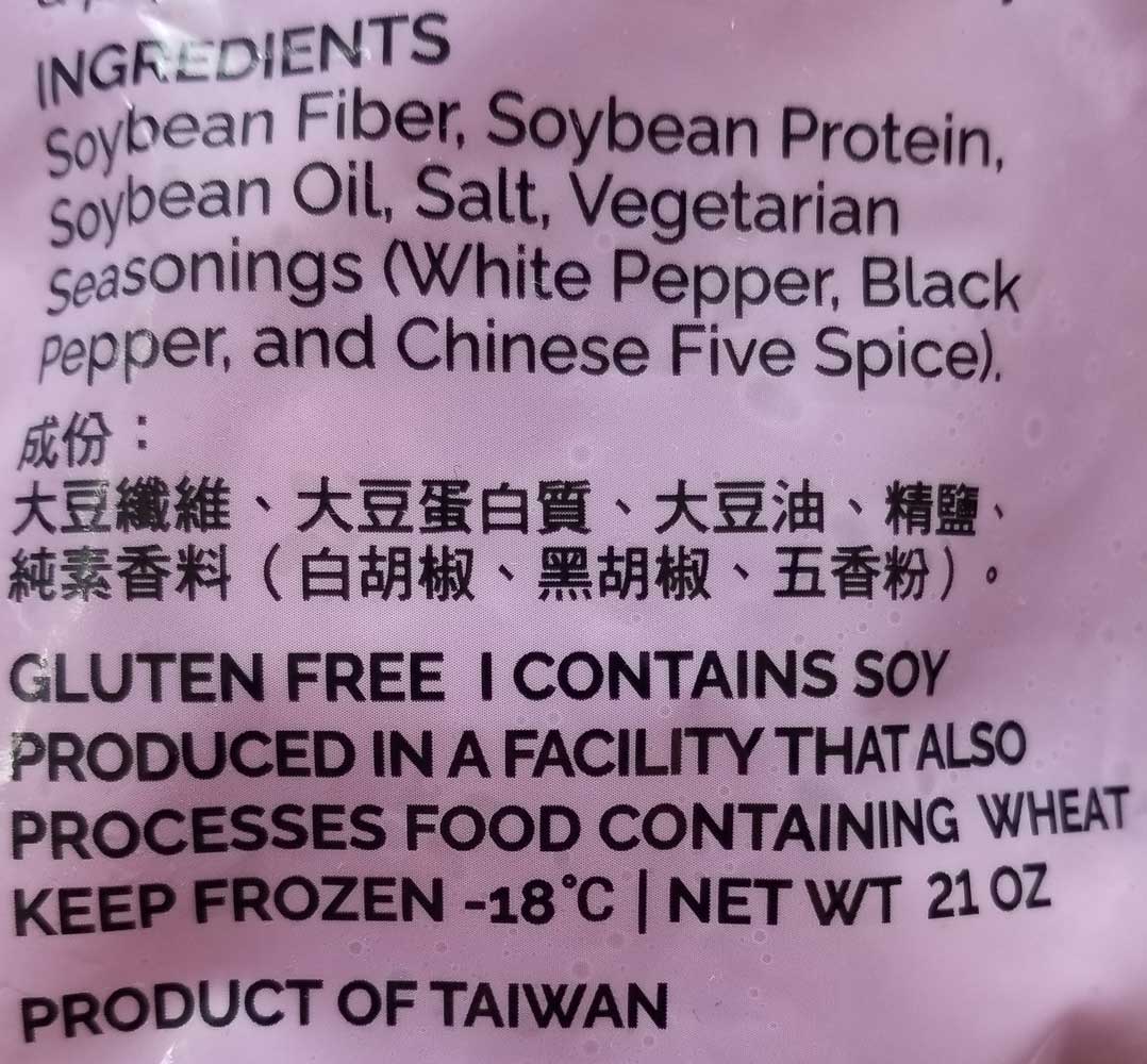 Ingredients: Soybean Fiber, Soybean Protein, Soybean Oil, Salt, Vegetarian Seasonings (White pepper, black pepper, Chinese five spice).