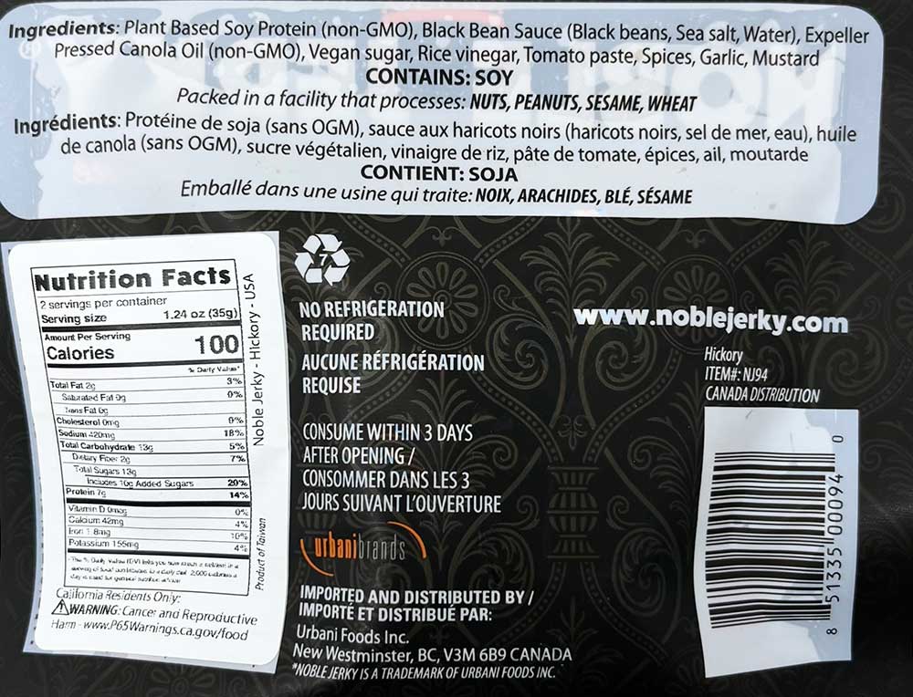 Ingredients Hickory : Non-GMO soy protein, black bean sauce (black beans, sea salt, water), non-GMO expeller pressed canola oil, vegan sugar, rice vinegar, tomato paste, spices, garlic, mustard