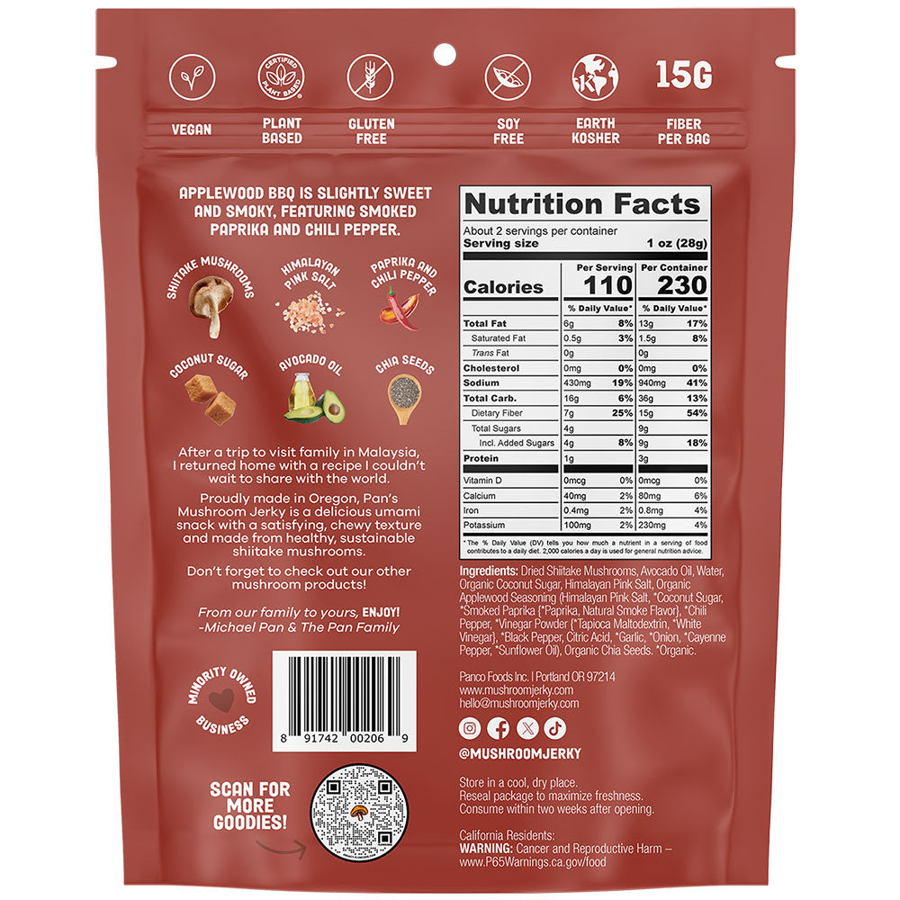 Ingredients Applewood BBQ: Organic dried shiitake mushrooms, avocado oil , organic coconut sugar, water, Himalayan pink salt, organic applewood seasoning (Himalayan pink salt, organic coconut sugar, organic smoked paprika [organic paprika, natural smoke flavor], organic chili pepper, organic vinegar powder [organic tapioca maltodextrin, organic white vinegar], organic black pepper, citric acid, organic garlic, organic onion, tricalcium phosphate, organic cayenne pepper, organic sunflower oil), organic chia seeds