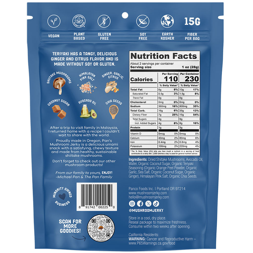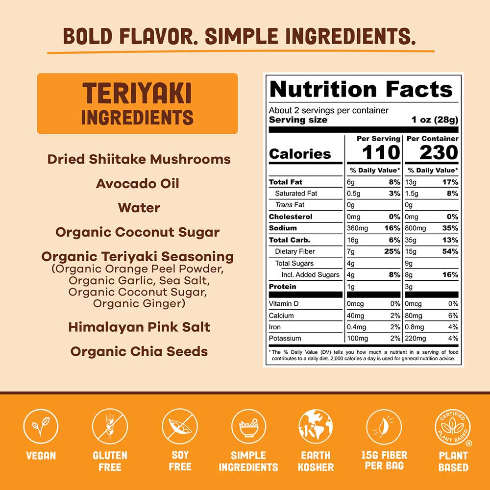 Ingredients Teriyaki: Organic dried shiitake mushrooms, organic coconut sugar, avocado oil, water, organic teriyaki seasoning (organic orange peel powder, organic garlic, sea salt, organic coconut sugar, organic ginger), Himalayan pink salt, organic chia seeds