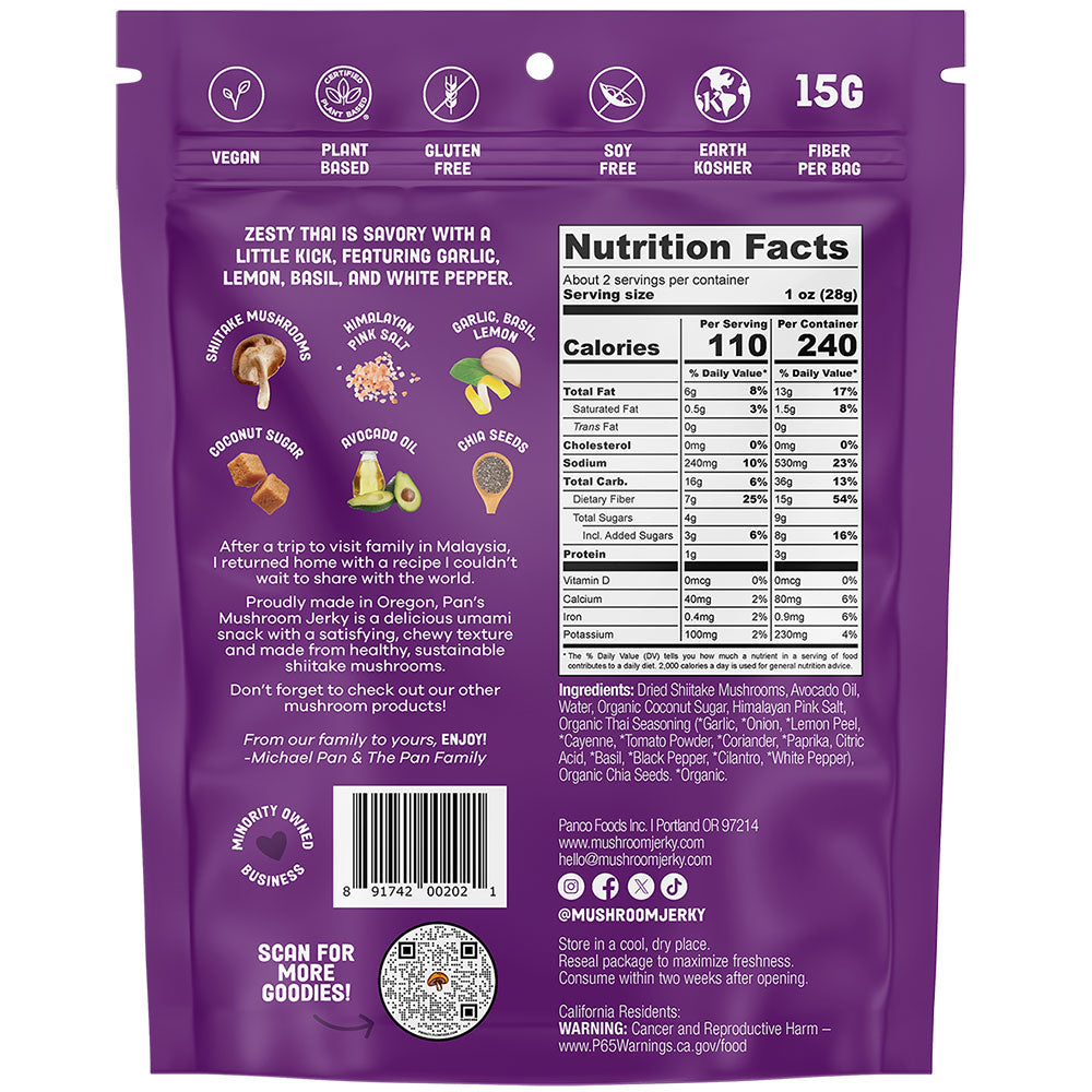 Ingredients Zesty Thai: Organic dried shiitake mushrooms, avocado oil, organic coconut sugar, water, Himalayan pink salt, organic Thai seasoning (organic garlic, organic onion, organic lemon peel, organic cayenne, organic tomato powder, organic coriander, organic paprika, organic citric acid, organic basil, organic black pepper, malic acid, organic cilantro, organic white pepper), organic chia seeds
