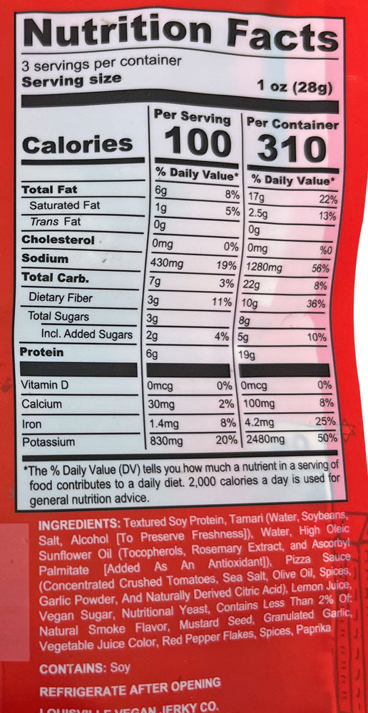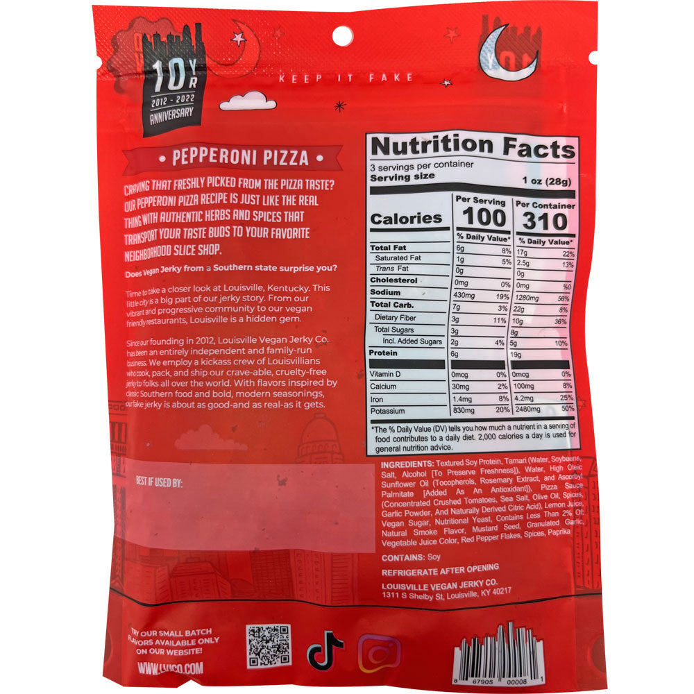 Made with GMO-free soybeans, this vegan jerky is gluten-free, packed with over 20 grams of healthy soy protein and fiber, and tastes great with the perfect balance of spices to give you amazing tomato and pepperoni flavor in every bite (without the meat, of course!)