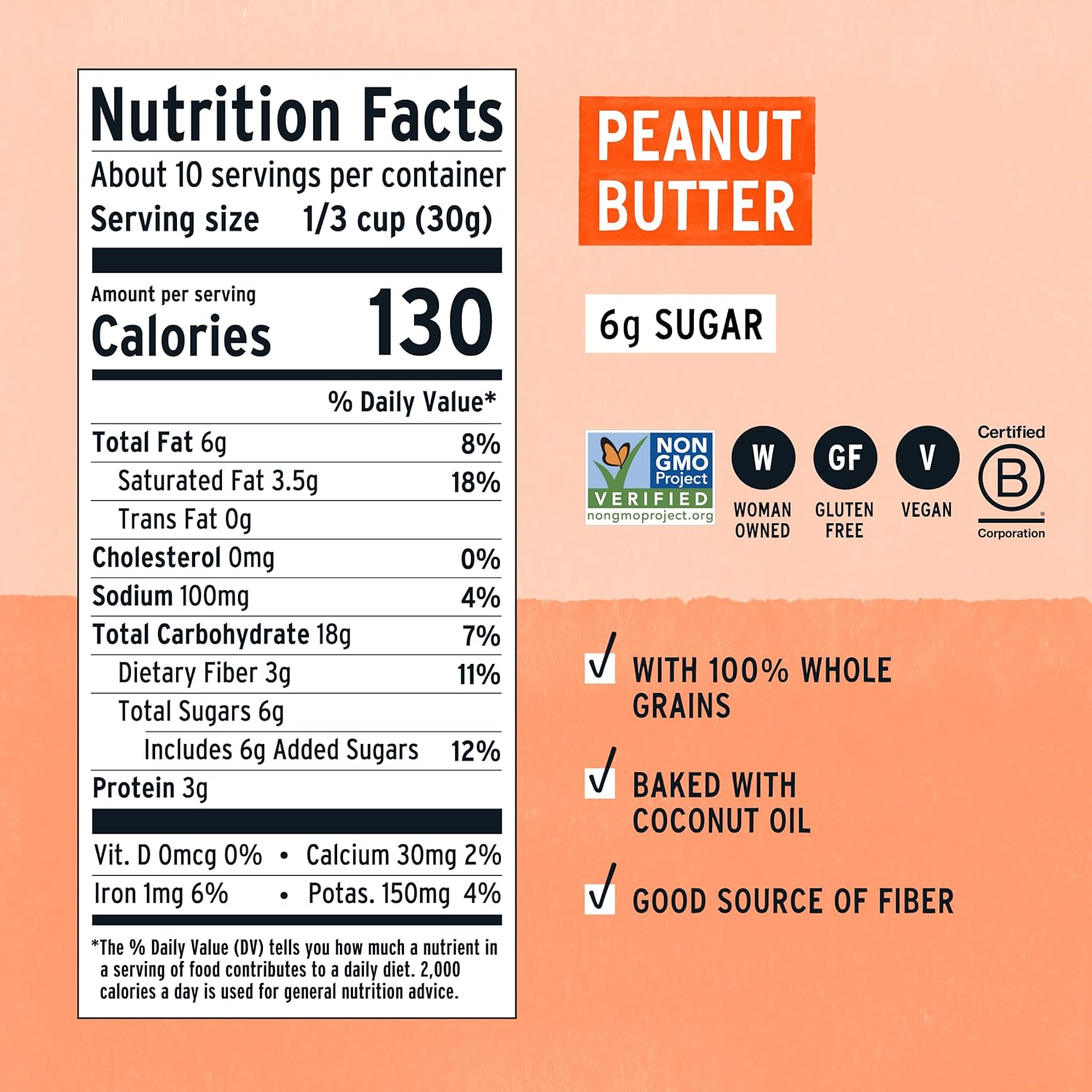 Organic Certified Gluten-Free Oats, Organic Coconut Sugar, Organic Coconut Oil, Organic Certified Gluten-Free Oat Flour, Peanut Butter, Organic Peanut Butter Chips (Organic Peanut Flour, Organic Coconut Sugar, Organic Cocoa Butter, Sea Salt), Maple Syrup, Chicory Root Fiber, Organic Coconut Flour, Organic Chia Seeds, Vanilla Extract, Leavening (Cream of Tartar, Baking Soda), Sea Salt, Natural Flavor.