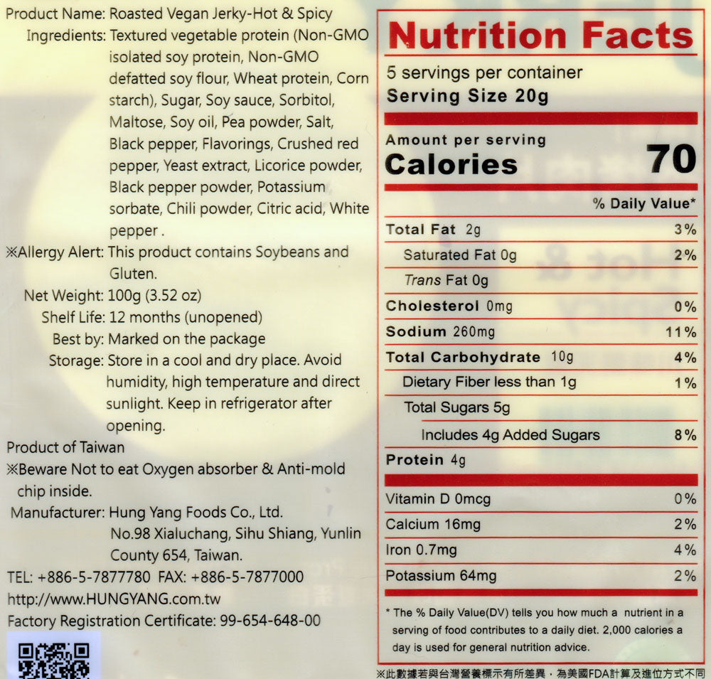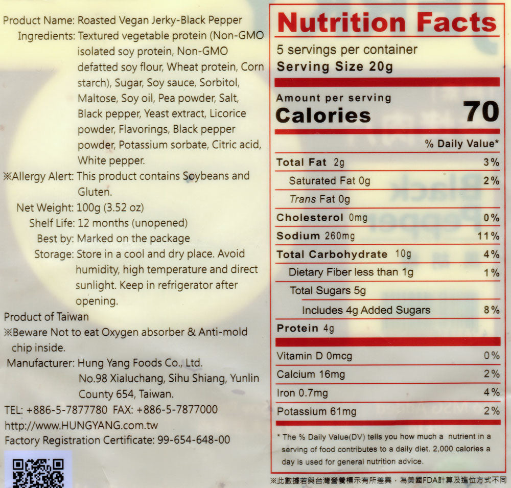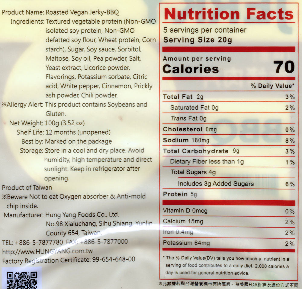 Do you love vegan jerky but miss the tough, chewy texture that most brands don't have? Sick of the soft stuff that chews up easily without much work? If so, get ready to be happy again, as we're pleased to offer Su Mama's (formerly Hung Yang) delicious Roasted Vegan Jerky, imported from Taiwan and packed with both flavor and that chewy texture most vegan options don't offer.