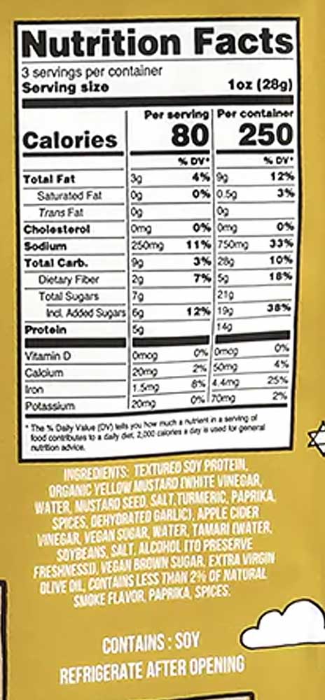 Ingredients: Textured soy protein, yellow mustard, apple cider vinegar, non-bone char sugar, San-J tamari (water, soybeans, salt, alcohol), non-bone char brown sugar, olive oil, chili powder, contains less than 2% of: spices, natural smoke flavor