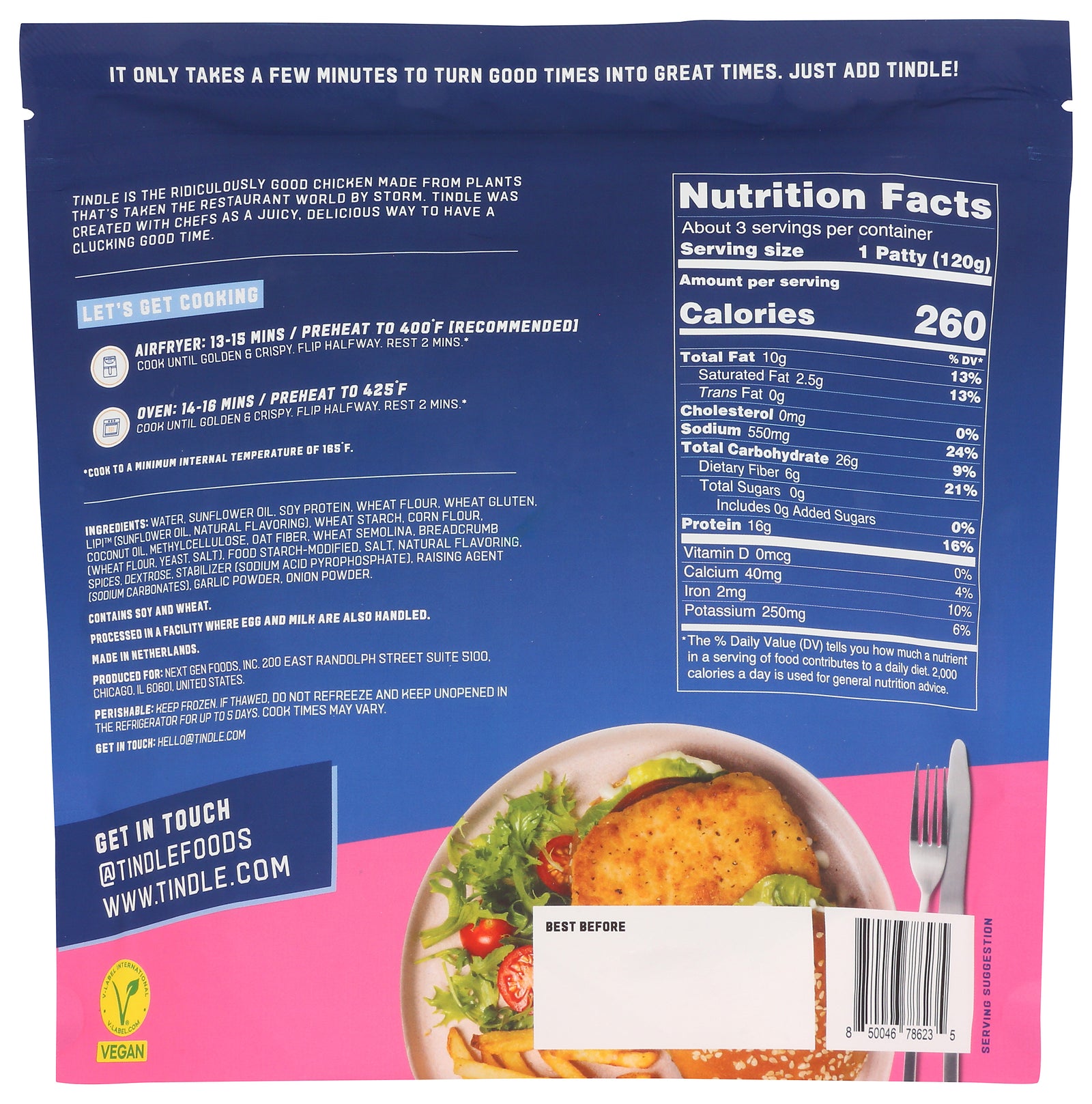 Free from GMO ingredients and cholesterol, TiNDLE Chicken Patties are processed in a facility handling egg and milk, making them suitable for various dietary needs.