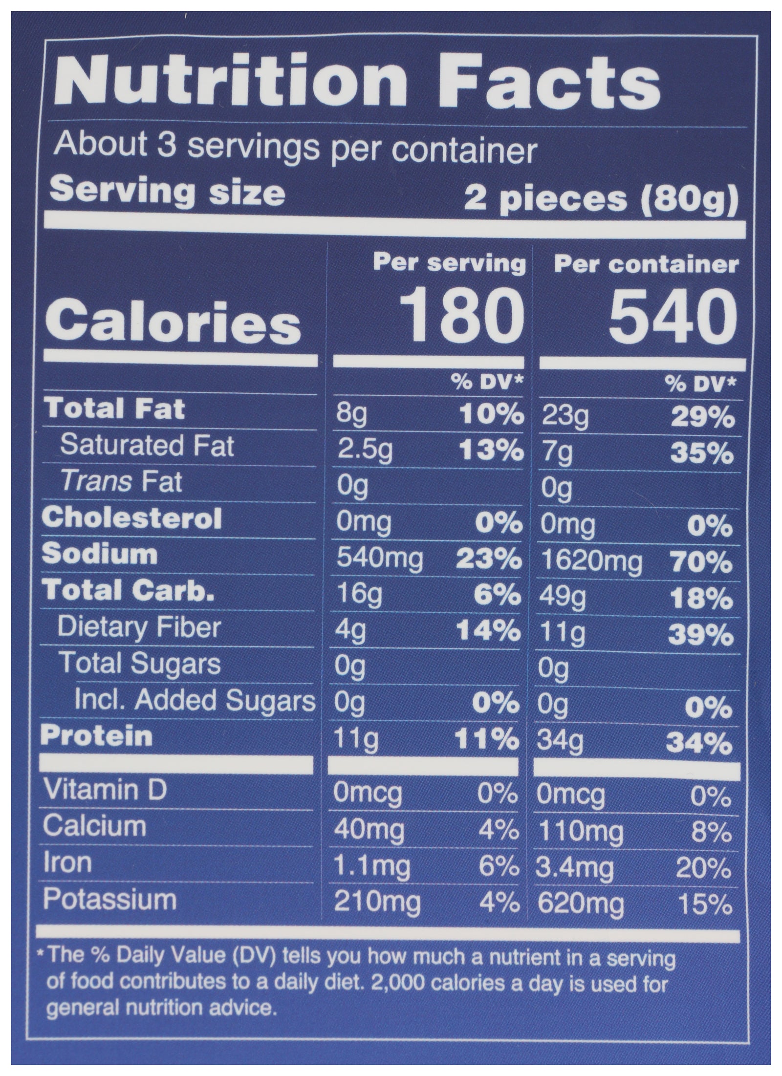 Water, Wheat Flour, Soy Protein, Sunflower Oil, Wheat Starch, Wheat Gluten, Lipi™ (Sunflower Oil, Natural Flavoring), Breadcrumb (Wheat Flour, Yeast, Salt), Corn Flour, Coconut Oil, Natural Flavoring, Methylcellulose, Oat Fiber, Wheat Kernels, Spices, Salt, Food Starch-Modified, Dextrose, Stabilizer (Sodium Acid Pyrophosphate), Raising Agent (Sodium Carbonates).