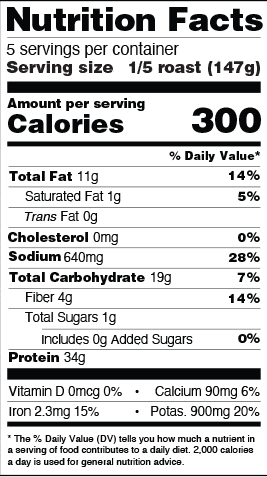 PLANT-BASED ROAST: Vital wheat gluten, water, tofu (water, soybeans, magnesium chloride, calcium chloride), expeller pressed canola oil, natural flavors, sea salt, contains less than 2% of onion, carrot, celery, garlic, leek, rosemary extract, lemon juice concentrate, oat fiber, corn starch, calcium lactate, potassium chloride. CONTAINS: WHEAT, SOY.