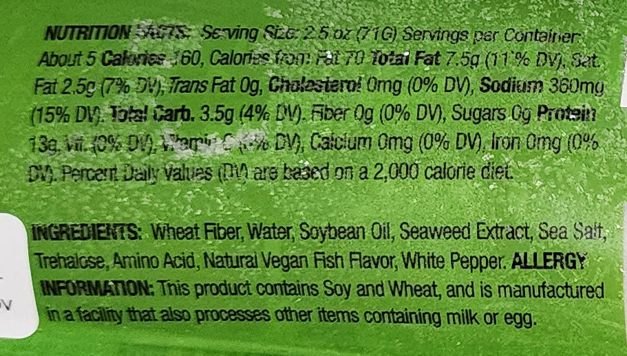 Ingredients: Wheat Fiber, Water, Soybean Oil, Seaweed Extract, Sea Salt, Trehalose, Amino Acid, Natural Vegan Fish Flavor, White Pepper. ALLERGY INFORMATION: This product contains soy and wheat, and is manufactured in a facility that also processes other items containing milk or egg.