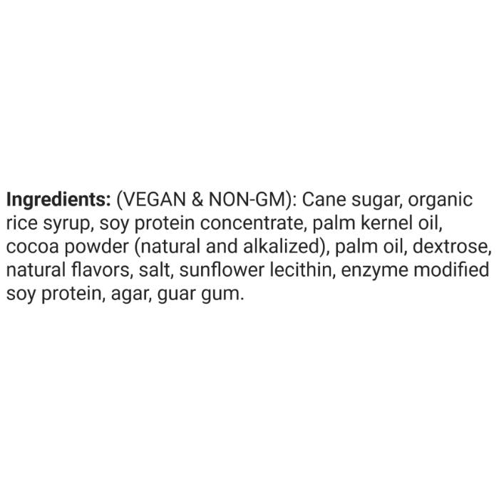 Ingredients: Cane sugar, organic rice syrup, soy protein concentrate, sustainably-sourced palm kernel oil, cocoa powder (natural and alkalized), palm oil, dextrose, natural flavors, salt, sunflower lecithin, enzyme modified soy protein, agar, guar gum