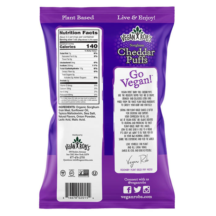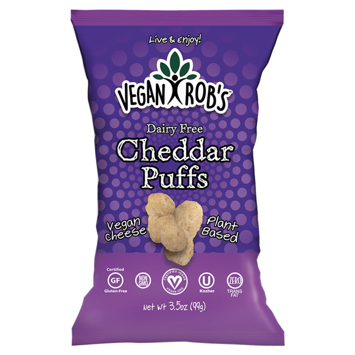 Vegan Rob’s Dairy-Free Cheddar Puffs are made from nutritious sorghum grain and flavored with natural ingredients. They’re light, creamy, and super crunchy. This is a gluten-free snack with no trans fat and lots of fiber and protein. Enjoy as a snack, alone or with friends!